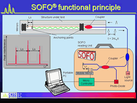 它基于與點光傳感器部分所述相同的白光干涉測量基本原理以上。來自白光源的光通過光纖傳輸?shù)焦鈱W(xué)傳感器。這里的傳感器由一個光纖耦合器組成,該光纖耦合器分成兩根不同長度的光纖,每端都有一個微型鏡子。參考該配置作為Mach-Zehnder或傳感干涉儀。入射光脈沖由耦合器分成兩個脈沖,并且在返回時,兩個脈沖在時間上分開t = 2nLs / c,其中n表示玻璃纖維的折射率,Ls 表示纖維的長度差異和c光速。一根光纖連接到被測結(jié)構(gòu)上,而另一根光纖非常接近但沒有連接。結(jié)構(gòu)的變形導(dǎo)致路徑差2nLs 的變化。在這種情況下,它通過使用掃描移動設(shè)備來測量