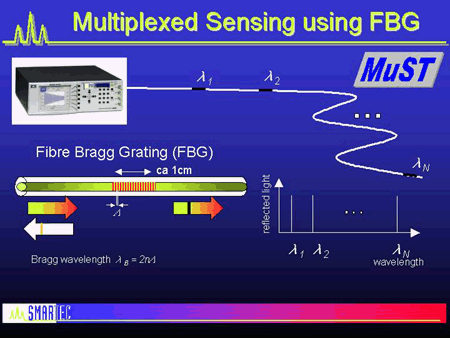 準(zhǔn)分布式或多路復(fù)用傳感器:被測量沿著單根光纖在許多固定的離散點處確定光纜。最常見的例子是多路復(fù)用FBG。